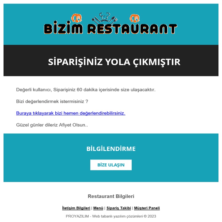Kullanıcılarınız sipariş verdiği zaman anlık olarak teşekkür mesajı iletilir. Admin paneli üzerinden siparişi yola çıktı olarak işaretleyip kaç dakika da ulaşacağını seçerseniz kullanıcıya bilgilendirme maili gider.